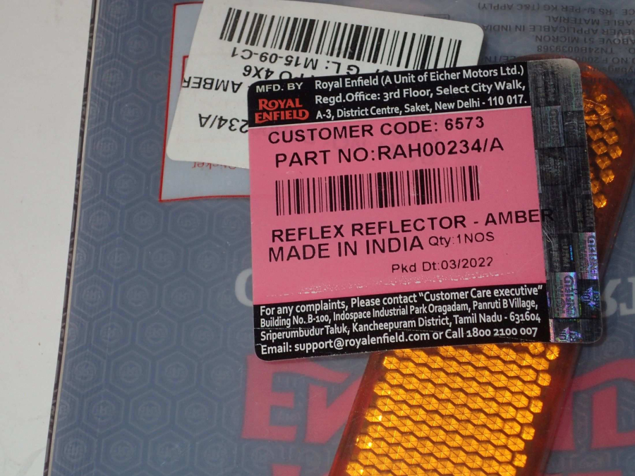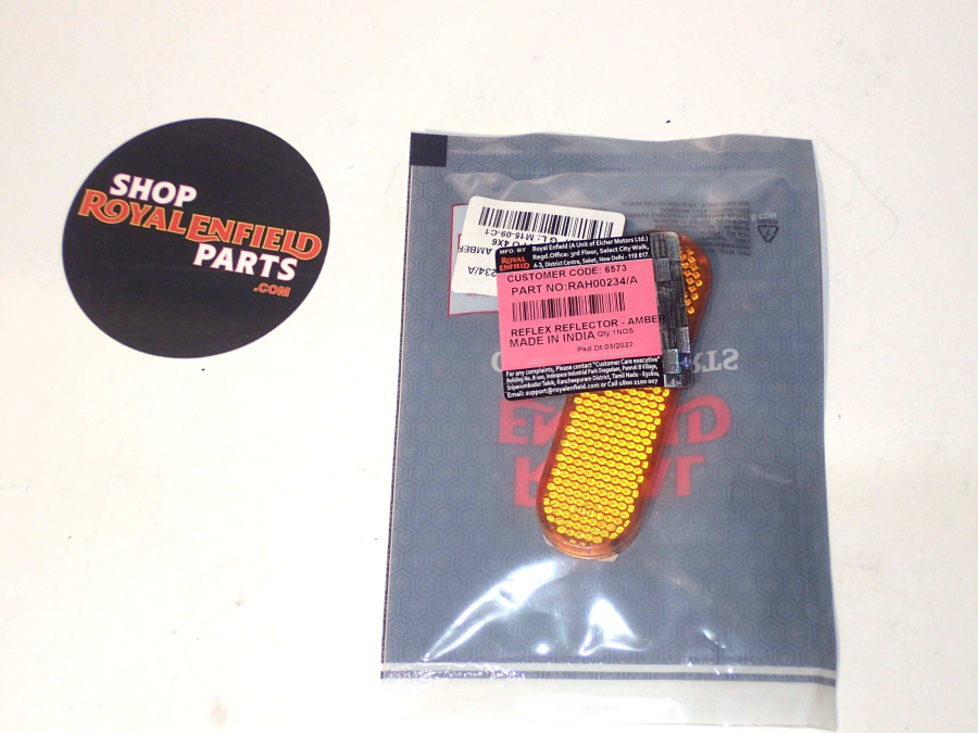 A genuine, amber colored reflector used on various Royal Enfield models, including the Himalayan and 500cc (BS4) bikes, designed to be an exact replacement for the factory-fitted part, ensuring visibility and compliance with safety standards.